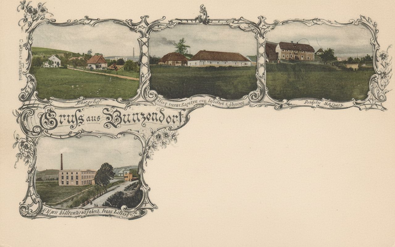 Továrna Liebiegovy vlněné textilky, Bucheltův hostinec a fabrika Christopha & Unmacka v Boleslavi (Bunzendorf) na montované domy kolem roku 1900. Připomínka našeho průmyslového dědictví.