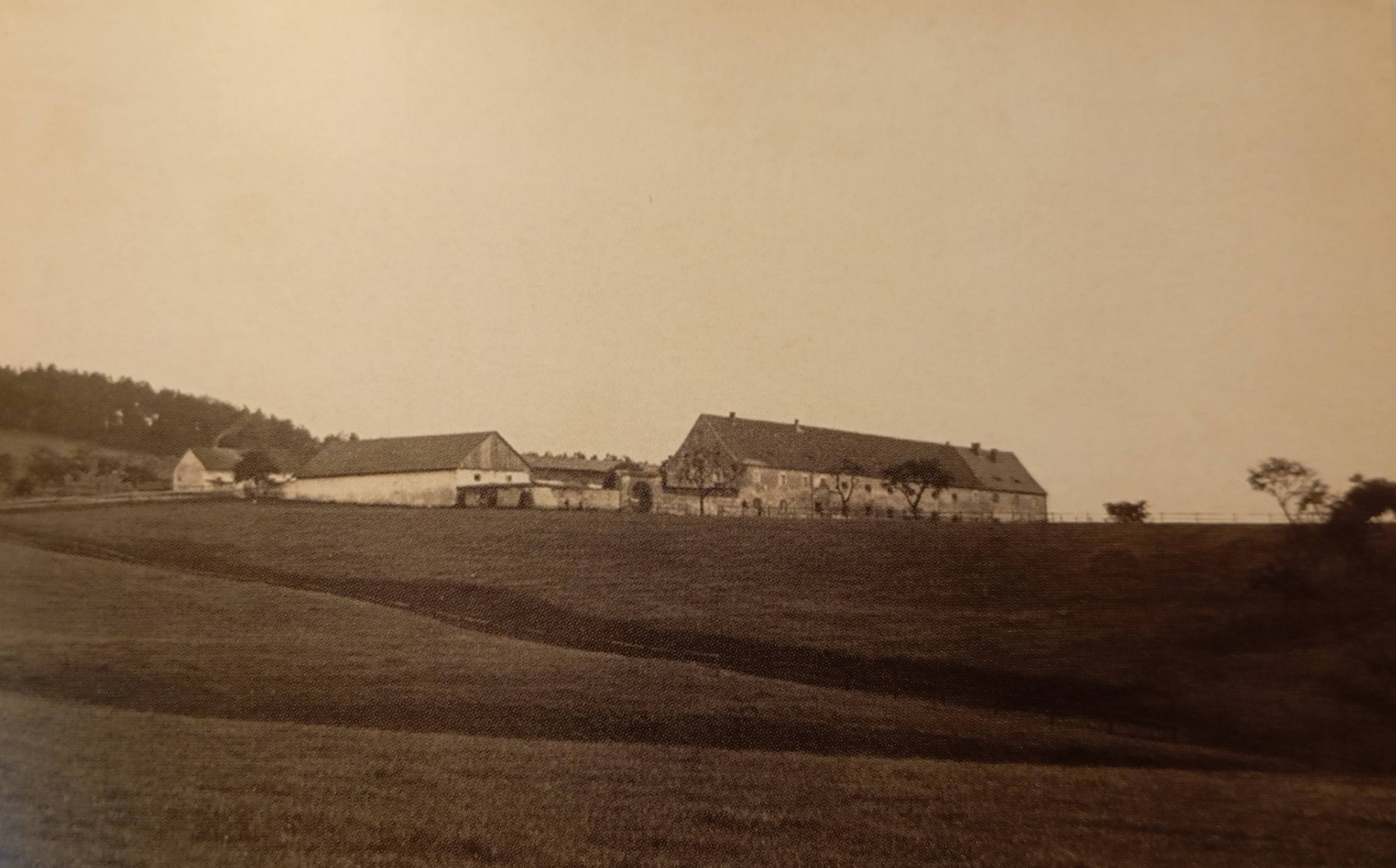 Černá Novina v roce 1920 - Černá Novina s Ještědem, dům vlevo dole pravděpodobně místní obchod (zdroj: Kovařík - Krčil - Prášil - Šťastný - Ralsko na starých pohlednicích, 2014)