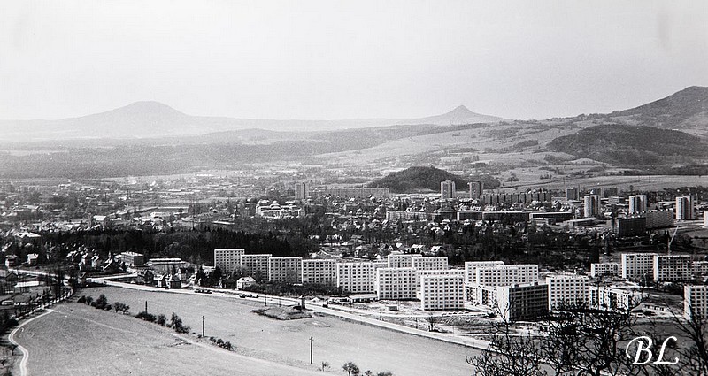 výhled z rozhledny na Špičáku, když sídliště Sever bylo ještě mladé. Přibližně rok 1980, škola se teprve začíná stavět. A u hlavní silnice je trafačka a stará vodárna, nebo spíš vodojem z konce 19.století, napájený z pramenů v kopcích nad Slunečnou a to samospádem.
