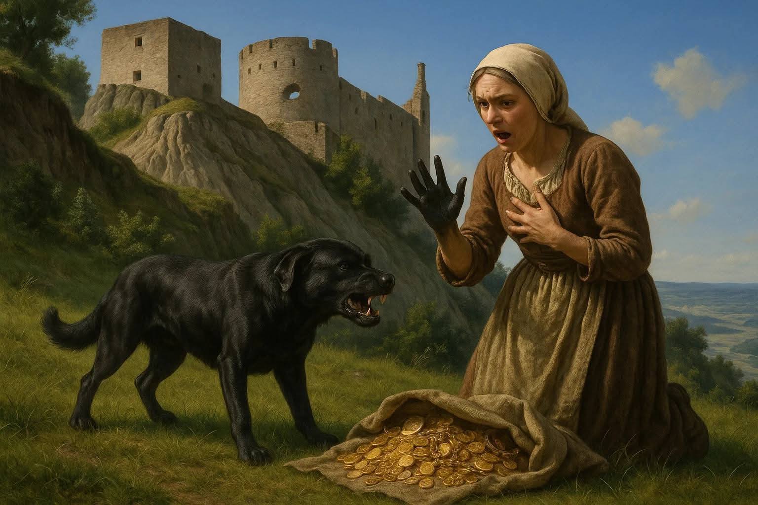 V dobách po třicetileté válce, žila na Vartenberském panství jedna vdova jménem Kartuše. Měla malou dcerku Dorotku, která si nejraději hrála s jejích zvířátky na jejích dvorku. Při jedné takové hře, si Dorotka hrála na hledání pokladu. A v tom si vdova Kartuše vzpomněla na vyprávění kmotry Kateřiny o pokladu ukrytém v ruinách hradu Děvín. Kartuše to jako vdova s dcerkou neměla lehké a po válce bylo všeho málo. A tak se jednoho dne vydala s dcerkou na Děvin. Byl to Velký pátek v dubnu. Podle kmotřičky se skála do hradní klenotnice otevírala jen v tento den v roce a jen na krátkou chvíli v pravé poledne. Měl to být poklad ukřostěn místním lapkům, které v minulosti přepadávali kupce na cestách. Místo dobře znala, neboť tam často chodila se svou maminkou na houby a lesní jahody, když byla sama malá, jako je teď Dorotka. V ruinách Děvínu po chvíli našli puklinu ve skále.. Za puklinu stála těžká dřevěná vrata, kde byl vstup do hradní klenitnice. Kartuše věděla, že teď jí čeká úkol nejtěžší. Za vratama klenotnice má hlídat děsivý veliký pes a kdo nebude štěkat s ním, toho zakousne. Karuše ze všech sil otevřela těžká vrata a psa se nezallekla. Pro Dorotku to byla zábava, když s maminkou mohli štěkat na velkého psa. Okolo něj prošli až do samotné pokladnice. Po krátké chvíli šlo slyšet pohyb skály.Kartuše vzala co mohla unést a volala na Dorotku, že musejí běžet zpátky. Dorotka se ale zastavila u velkého strašlivého psa. A tak Kartuše po uzavření skály zůstala venku sama. Byla bezmocná a bezradná. I když měla poklad nemohla se radovat, o ten nejcennější poklad teď přišla. Věděla, že svou Dorotku uvidí nejdříve za rok. Farář Kartuši poradil ať všechen poklad rozdá chudým a potřebným a ať prosí o modlitbu za Dorotku. Rok se s rokem sešel a Kartuše stála před skálou, která by se měla každou chvílí otevřít. Stále se bála toho nejhoršího, aby její Dorotku velký pes nezakousl. Přišlo pravé poledne a skála se začala otevírat. Kartuše neváhala a běžela pro Dorotku. Když otevřela vrata viděla, jak si Dorotka s velkým strašidelným psem hraje. Popadla Dorotku a utíkala ven. Dorotka byla živá a zdravá. A Kartuše měla zpět ten nejcennější poklad, poklad všech pokladů. A tak jí ani nemrzlo, že všechen poklad z pokladnice rozdala chudým a potřebným. Při cestě domů se Dorotka usmála a řekla mamince, že přeci jen něco mají. A z horních kapes u zástěry vyndala zlaťáky. Tím byly zlé časy zažehnány a i chudým mohli pomáhat dále.