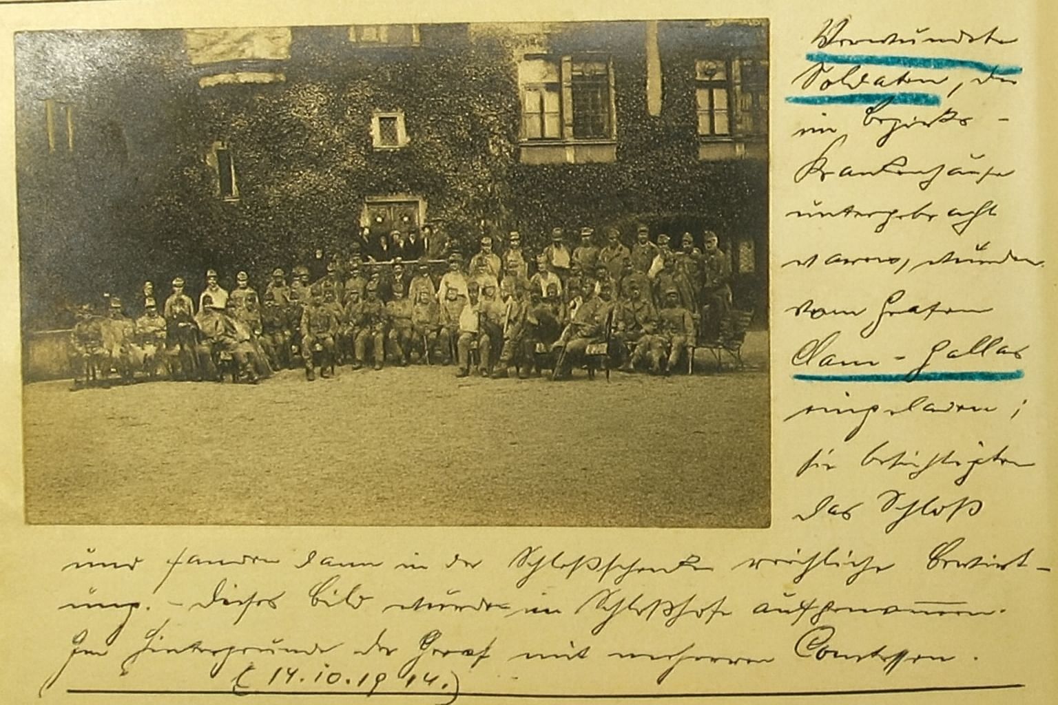 "Zranění vojáci , kteří byli umístěni v okresní nemocnici, byli hrabětem Clam-Gallasem pozváni a navštívili zámek. Poté byli v zámeckém šenku bohatě pohoštěni . Tento snímek byl pořízen na zámeckém nádvoří. V pozadí hrabě s několika komtesami. (14. 10. 1914)"