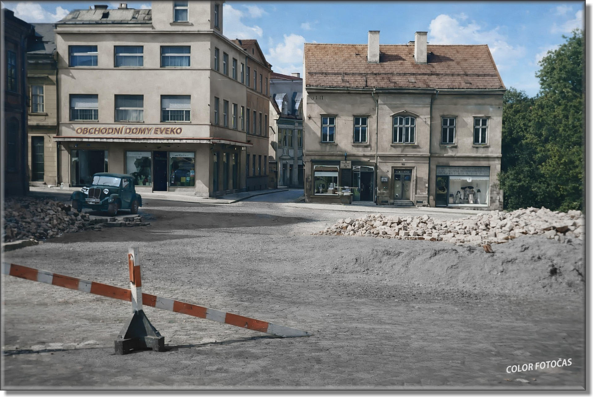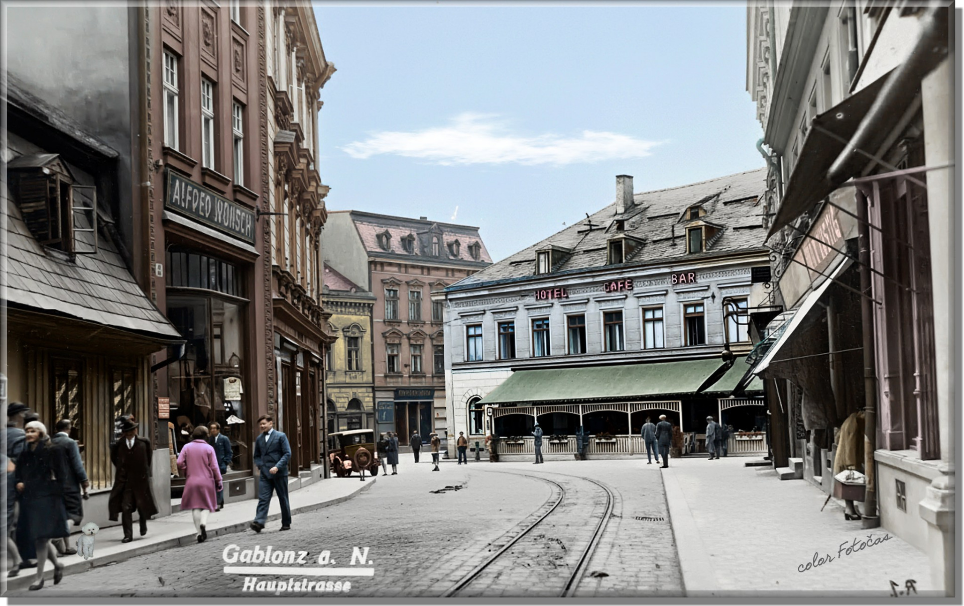 Jablonecká Hauptstrasse ve 30. letech a hotel Krone (Koruna)Snímek zachycuje pulzující atmosféru hlavní třídy Gablonze nad Nisou (dnešního Jablonce) ve 30. letech 20. století. Tehdejší Hauptstrasse, dnes Komenského ulice, byla tepajícím srdcem města – lemovaná reprezentativními budovami, obchody, kavárnami a hotely, s tramvajovými kolejemi uprostřed, které svědčí o moderním dopravním zázemí. Hotel Krone – Koruna městského životaDominantou pravé strany snímku je hotel Krone, později známý jako Koruna. Jeho historie sahá až do poloviny 17. století, kdy zde stával zájezdní hostinec Dorfschenke. V roce 1840 byl přestavěn na zděný hostinec a postupně se proměnil v vyhlášený hotel s vinárnou Reingold. V období před první světovou válkou si získal výbornou pověst, zejména díky hoteliérovi Josefu Hubovi.Ve 30. letech byl hotel Krone stále významným společenským bodem – místem setkávání obchodníků, cestujících i místních obyvatel. Jeho poloha na hlavní třídě zaručovala stálý ruch a prestiž. Tramvajky, které hotel objížděly, dotvářely obraz moderního města v srdci Sudet. Zánik a paměťPo druhé světové válce začal hotel chátrat, až byl roku 1953 zbourán. Na jeho místě vznikl park, ale sklepení zůstalo zachováno – jako tichý svědek někdejší slávy. V souvislosti s měnovou reformou roku 1953 si lidé hořce říkali: "Tak už nemáme ani Korunu." Tento krásně barevně upravený snímek od Fotočas nejen dokumentuje architekturu a městský život, ale evokuje i nostalgii po ztracené eleganci meziválečného Jablonce. Je to okno do doby, kdy Hauptstrasse byla skutečnou páteří města – a hotel Krone jeho korunou.