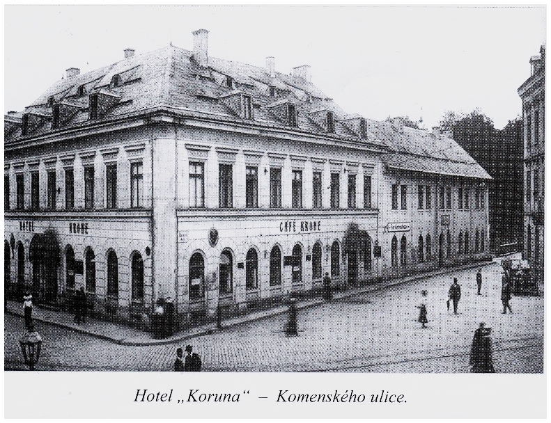 Hotel Koruna, známý také jako Hotel Krone, stával na dnešní Komenského