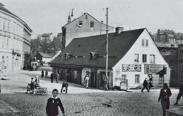 - úplně vpravo vykukuje "Mléčný bar" na křižovatce ulic Lidická, 5.Května a Dlouhá - ani jeden z domů v popředí už nestojí