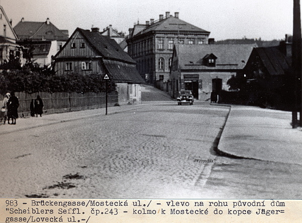 snímku je zachycena Mostecká ulice (německy Brückengasse). Vlevo na
