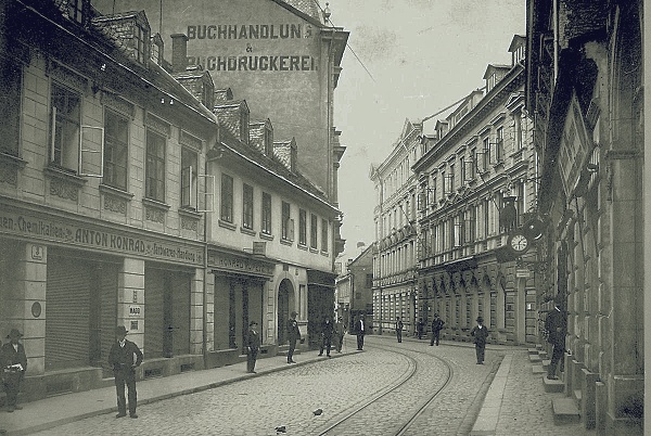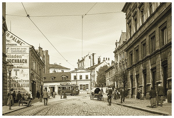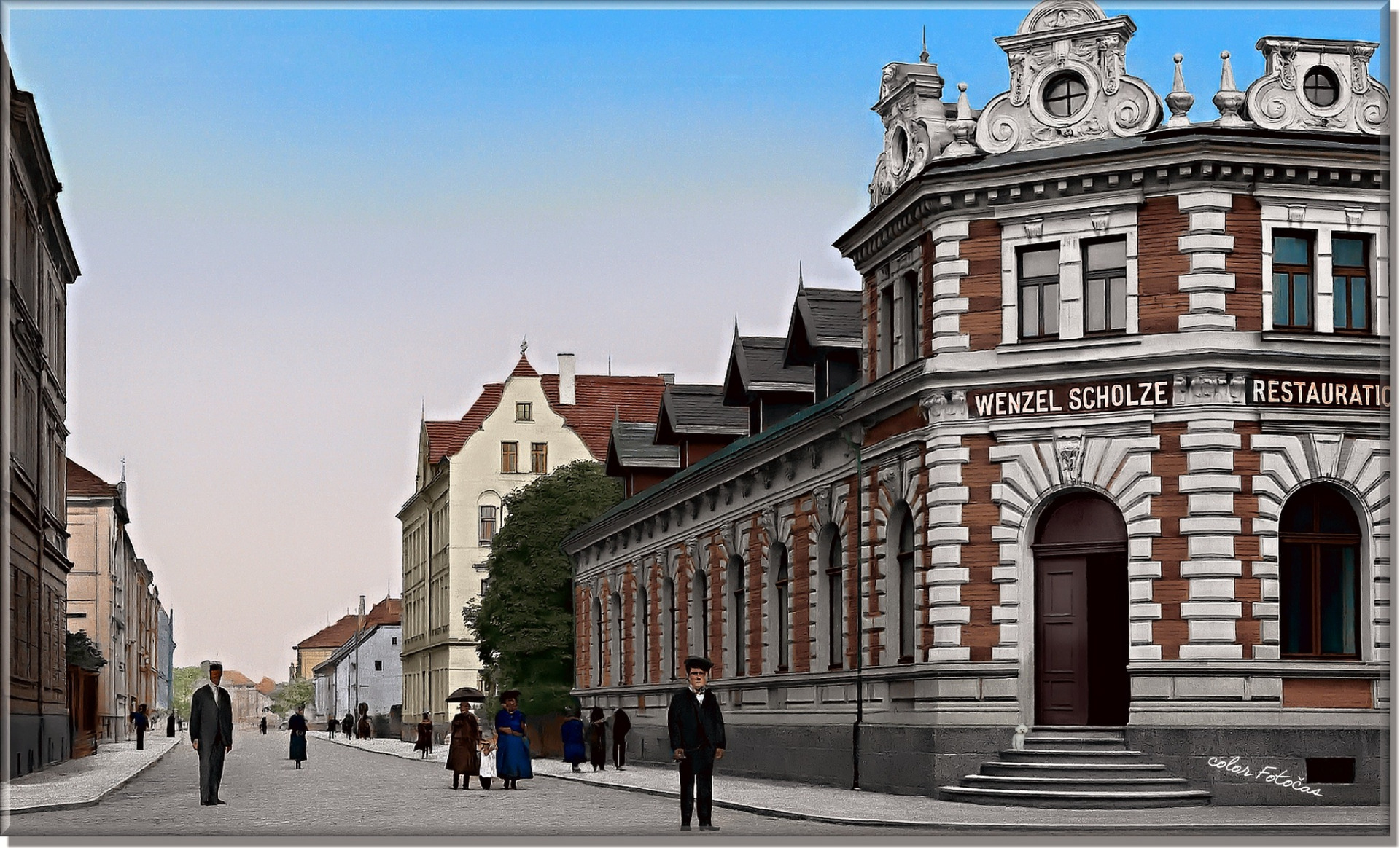 ulice honosná budova restaurace Wenzel Scholze, vystavěná v bohatém