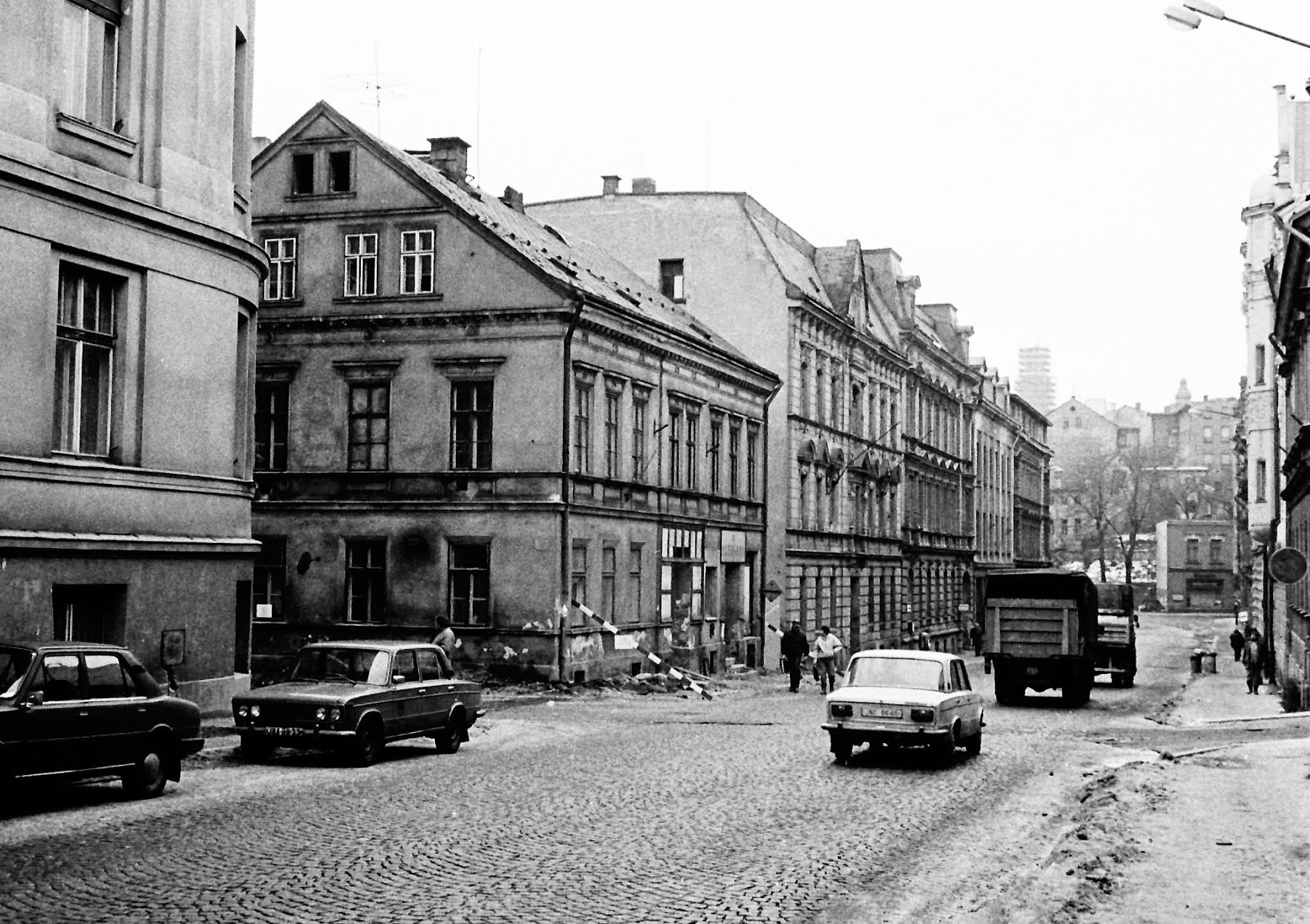 - úplně vpravo vykukuje "Mléčný bar" na křižovatce ulic Lidická, 5.Května a Dlouhá - ani jeden z domů v popředí už nestojí