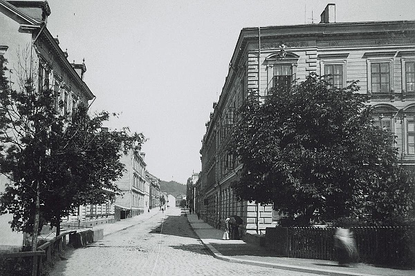 členitými fasádami, které dodávají ulici rytmus a hloubku. Stromy