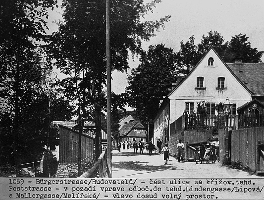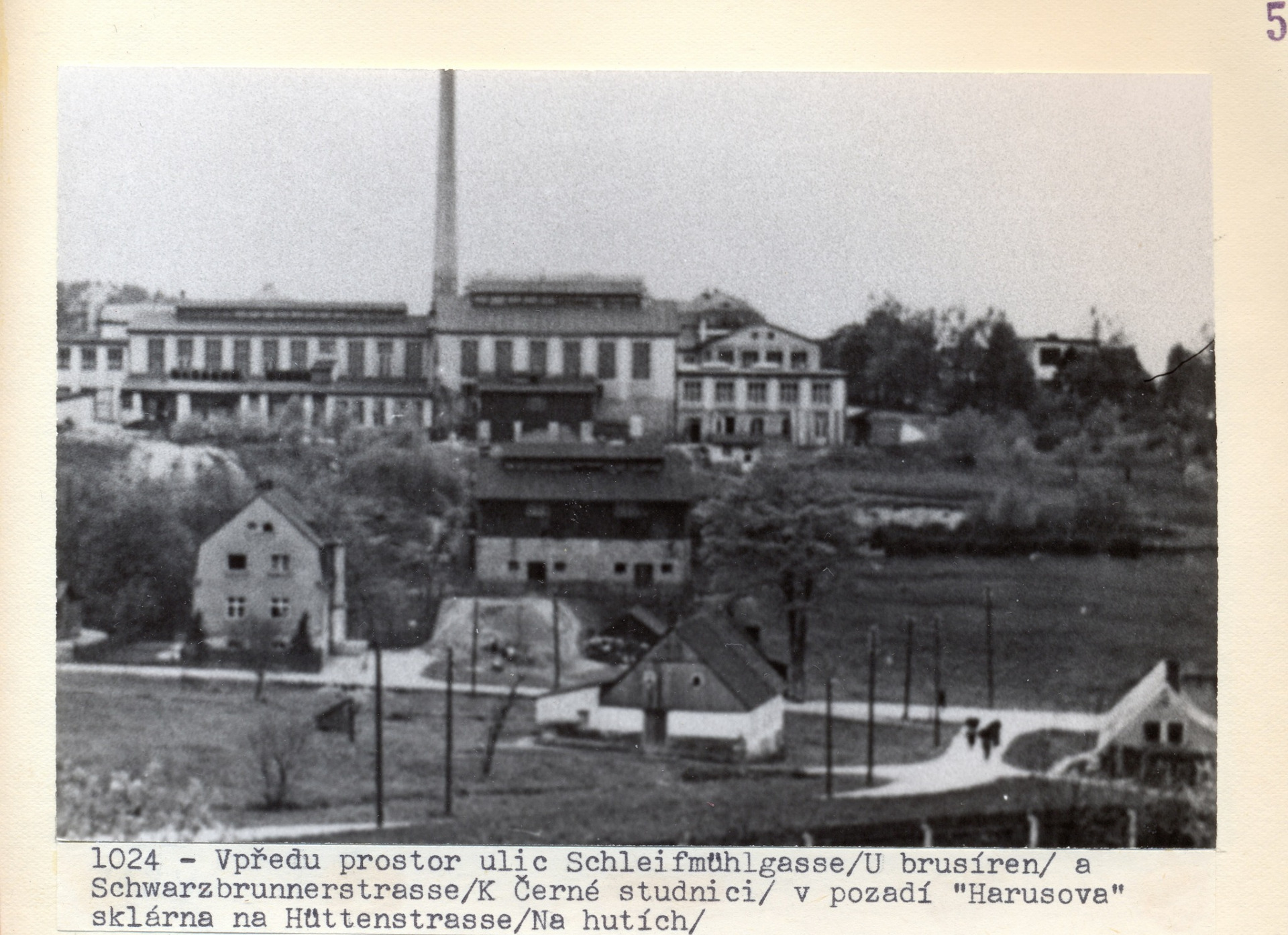 Na snímku se otevírá pohled do prostoru někdejších ulic Schleifmühlgasse (U brusíren) a Schwarzbrunnerstrasse (K Černé studnici), jak existovaly v době před zásadními urbanistickými proměnami. V popředí vidíme klidnou scenérii s několika obytnými domky, zakřivenou cestou a dvěma postavami, které dodávají kompozici lidský rozměr. V pozadí se tyčí komín "Harusovy" sklárny na Hüttenstrasse (Na hutích), připomínající industriální charakter této části Jablonce nad Nisou.