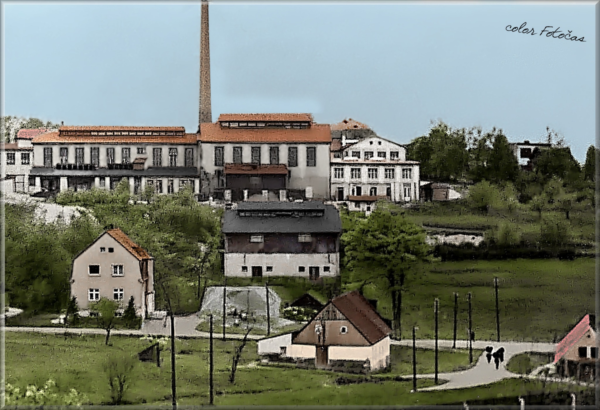 Fotografie zachycuje jedinečný kontrast mezi obytnou a průmyslovou zástavbou, mezi každodenností a výrobní činností, která formovala tvář města. Stromy lemující okraje snímku naznačují, že i v blízkosti továren zůstával prostor pro zeleň a klid. Tento obraz je cenným svědectvím o době, kdy se Jablonec rozvíjel jako centrum sklářského průmyslu, a zároveň uchovává atmosféru místa, které dnes již existuje jen v paměti a na archivních fotografiích.