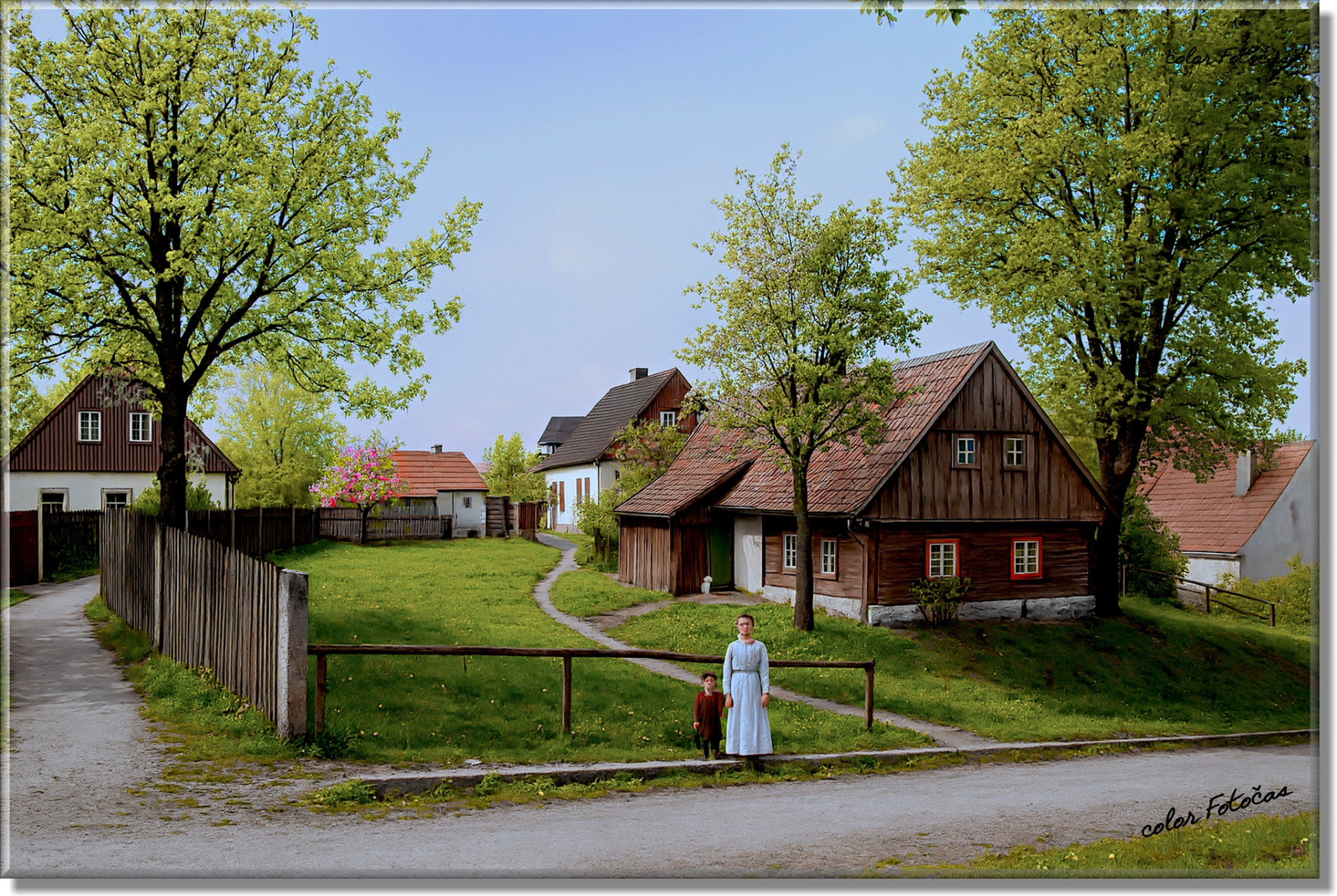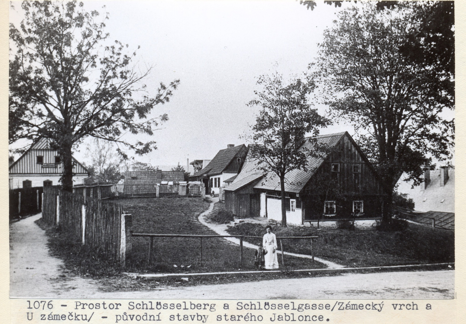 Na snímku vidíme původní stavby, které pamatují dobu, kdy Jablonec byl ještě vesnicí pod zámkem. Žena v dobovém oděvu stojící u plotu jako by strážila paměť místa — tichého, prostého, ale hluboce zakořeněného v historii. Jaro dodává scéně svěžest a naději, zatímco staré domy vyprávějí příběhy generací, které zde žily, pracovaly a snily.