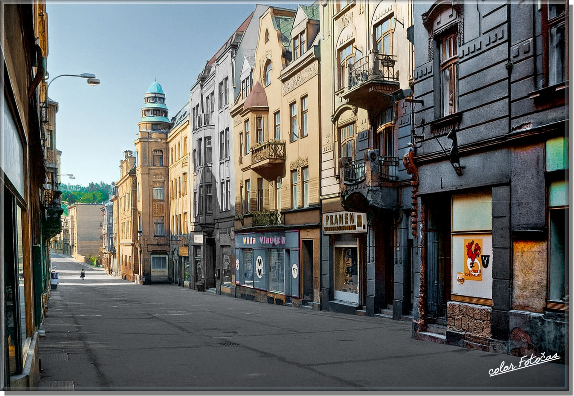 Ohořelý domek na křižovatce ulic "Střelecká a Hvězdná" u železničního mostu.Spodní fotka = pokus o montáž, kde domeček stával.... color Fotočas