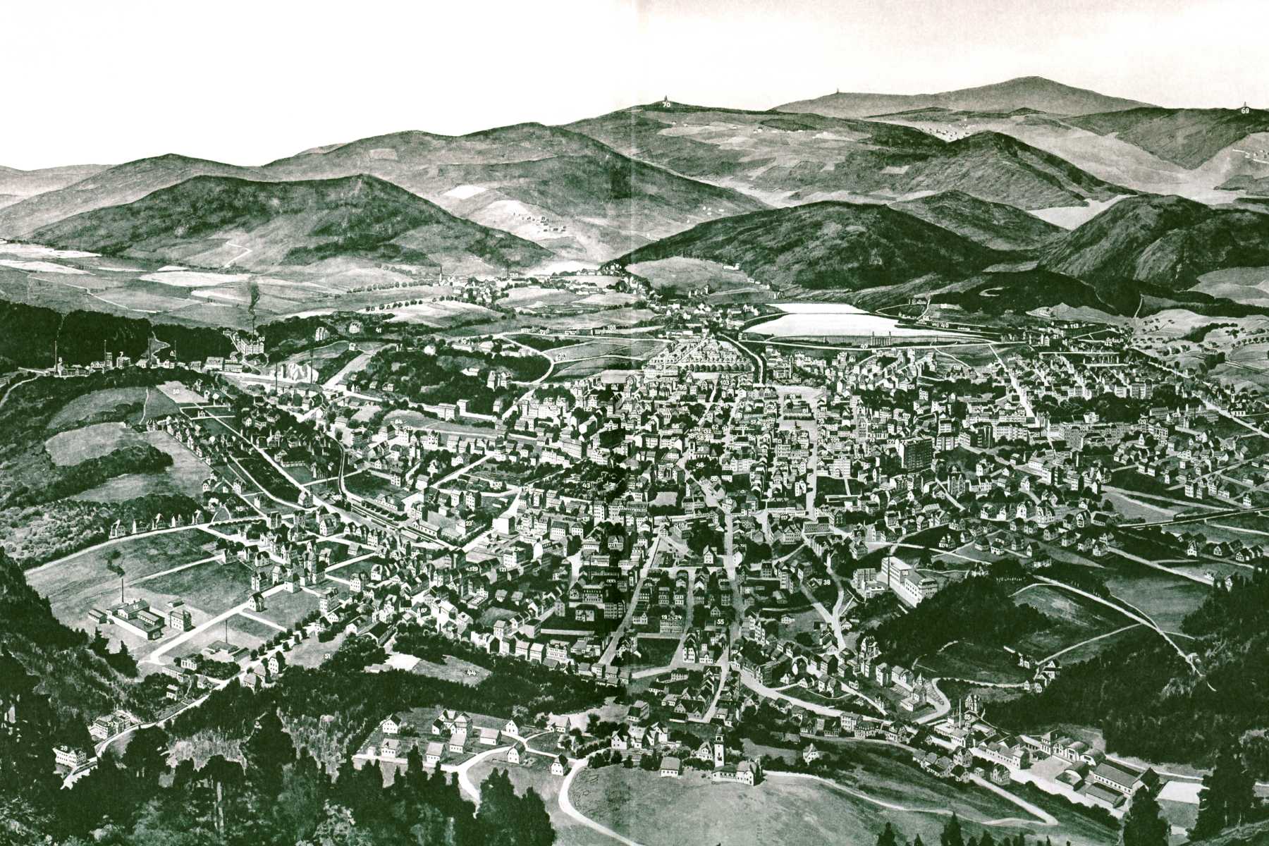 Vyvrcholení urbanistického vývoje města představovala meziválečná regulace centra, jež mu měla vtisknout velkoměstský výraz. Během ní byla postavena nová radnice (1933) a dotvořeno Horní náměstí (Gewerbeplatz) se Zascheho kostelem Nejsvětějšího srdce Ježíšova (1931) a Metznerovou kašnou (1930). Tím došlo k dovršení neopakovatelné a jedinečné urbanistické skladby tří kaskádovitých náměstí s nepřehlédnutelnými dominantami tří věží – staré i nové radnice a katolického kostela.