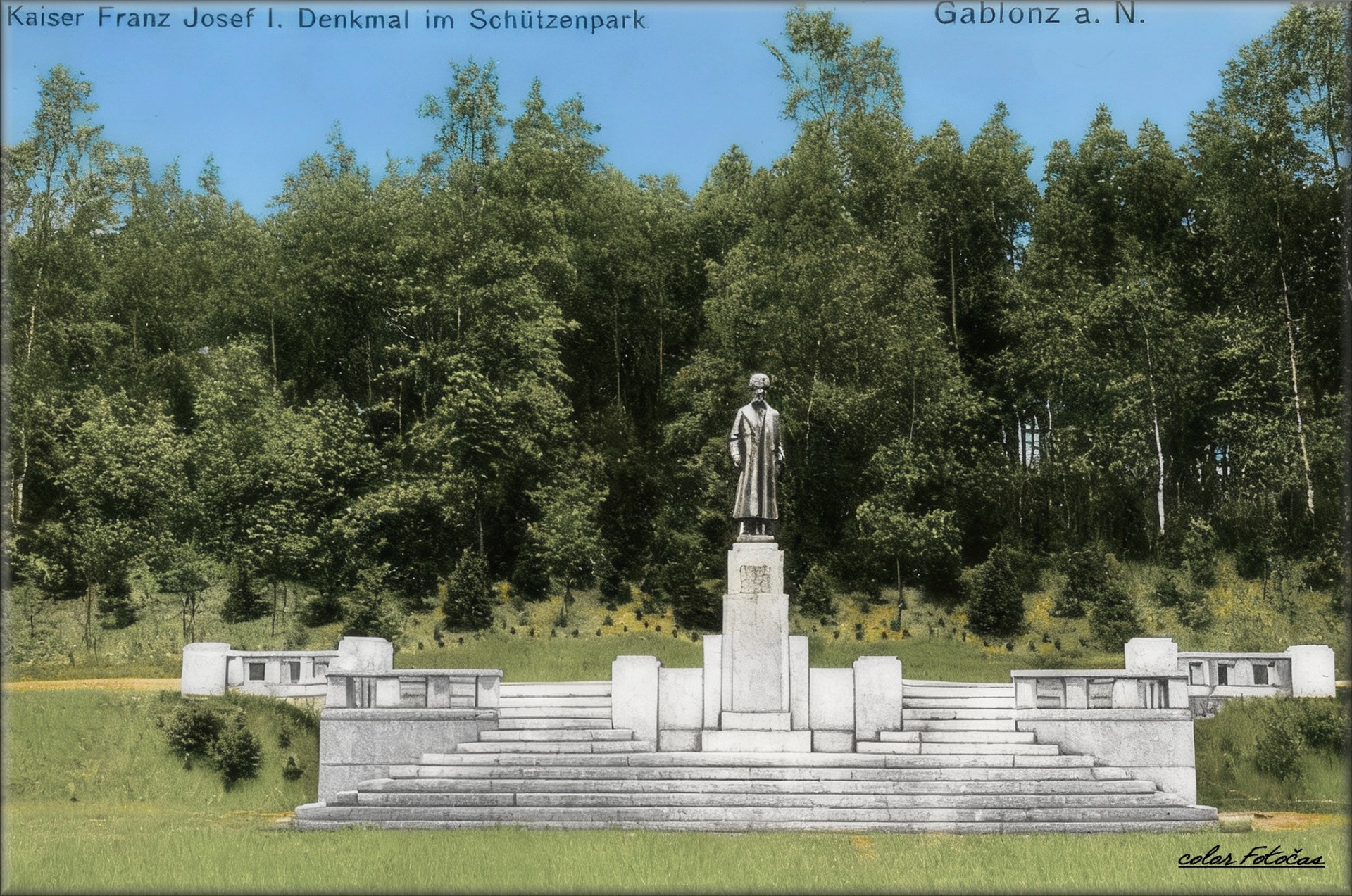 Schützenhaus /Střelnice/ - pomník tehdejšího císaře Františka Josefa I. v parku za budovou restaurace. Foto rok 1912." ------------------ Pomník císaře Františka Josefa I. na jablonecké střelnici byl postaven jako monumentální památník v roce kolem 1910, připomínající 60. výročí panování císaře (1908). Iniciátory jeho vzniku byli místní představitelé střeleckého spolku, hlavní zásluhy měli major Heinrich Endler, starosta Adolf H. Posselt a velkostatkář Wilhelm baron von Medinger. Autorem sochy byl významný západočeský sochař Adolf Mayerl, který zhotovil bronzovou sochu císaře oblečeného v maršálské uniformě, vysokou 2,8 metru. Pomník je umístěn v parku Střeleckého spolku (Střelecký park) s architektonickým řešením podstavce od Moritze Knaba, ze žuly z místního lomu. Pamětní deska na pomníku obsahuje nápis věnovaný 60. jubileu vlády císaře Františka Josefa I., památník byl odhalen slavnostně 14. srpna 1910 za účasti arcivévody Ferdinanda Karla a mnohých střeleckých spolků i obyvatel okolí. Pomník byl umístěn na jihu rozlehlého promenádního prostranství, obklopený prostorným schodištěm a balustrádami, v harmonii s okolní přírodou a lesem za ním. Bronzovou sochu odlila vídeňská firma A. Josef Selzer. Tento pomník nesl značný význam pro místní komunitu a patřil k význačným symbolům města v době Rakouska-Uherska před první světovou válkou. text Copilot color Fotočas Mirek