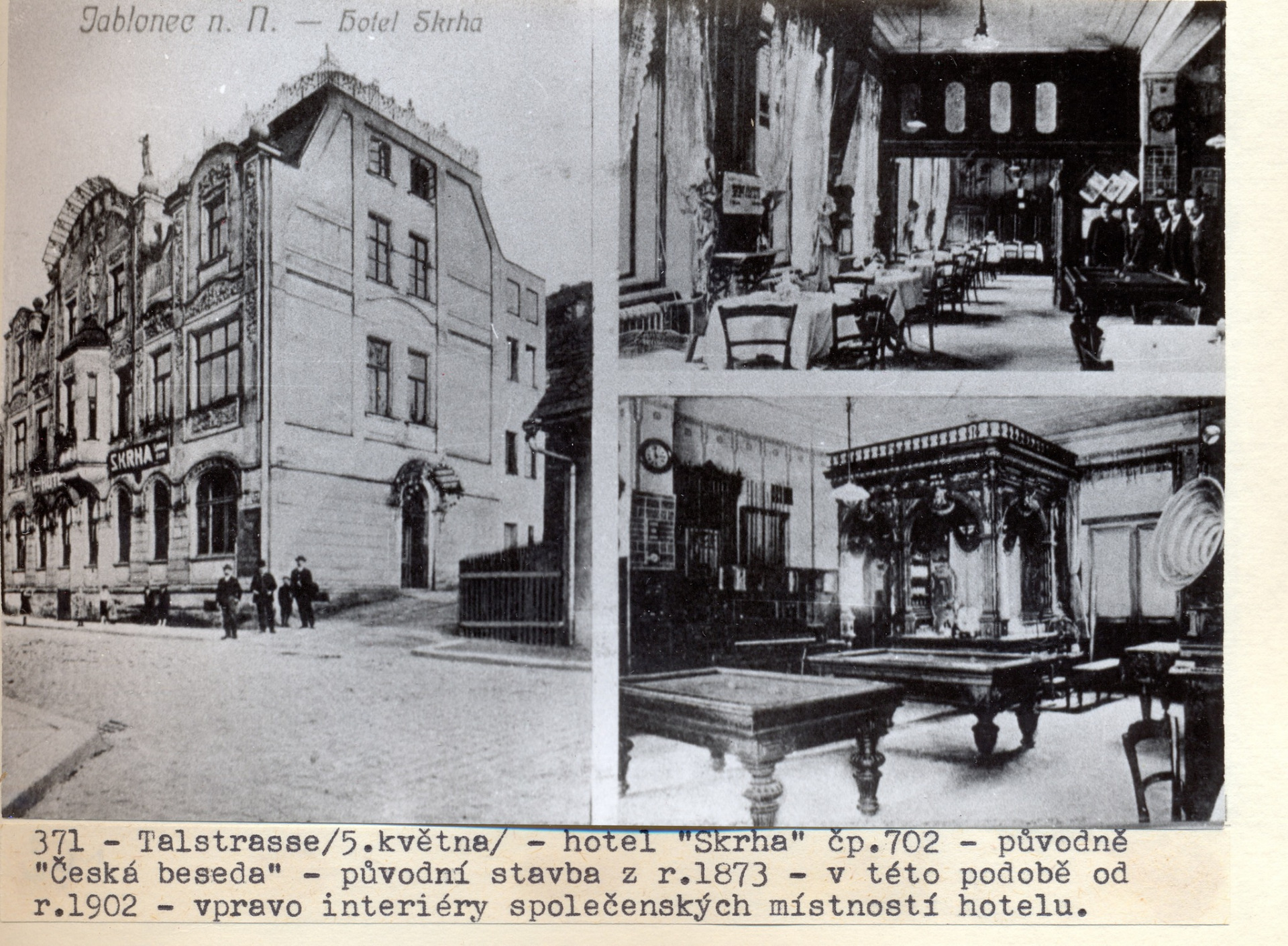 Roku 1890 si postavil v dnešní ulici 5. května, na místě zmíněné České besedy, Miloslav Skrha hotel, který po sobě pojmenoval. V tomto zařízení našla sídlo řada českých institucí. Nacházela se tu např. stanice Klubu čsl. turistů, autoklubu (AKRČsl.), ale i filiálka Živnostenské záložny v Turnově. Po obsazení pohraničí byl objekt přejmenován na "Hotel Egerläder" a hostinským se stal Anton Sommer. Po válce byl provoz hotelu Skrha obnoven, leč z bývalé slávy zbyla jen chátrající hospoda. Až v 90. letech nový vlastník objekt vkusně opravil a dal mu jméno Diana. Snad ho ona bohyně lovu ochrání.