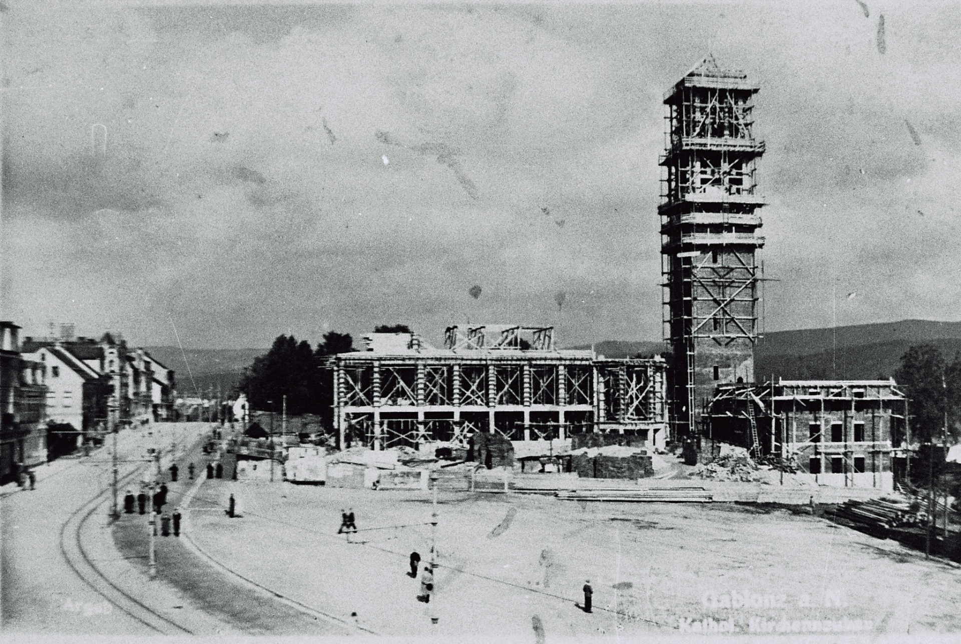 Velkorysý trojlodní objekt s příčnou lodí a hranolovou věží na jižní straně a s tehdy moderním obkladem z ostře pálených cihel (klinkerů) byl dokončen v roce 1932. Autorem návrhu byl významný architekt celoevropského významu, jablonecký rodák Josef Zasche, který v rodném městě navrhl dokonce chrámy dva. Vlastní stavbu provedla firma ing. Maxe Dauta a velká řada dalších místních firem. Pouze takové dodávky, pro které v místě neexistoval dostatečně kvalitní dodavatel byly svěřeny cizím firmám. Interiér nebyl vinou osudových změn dokončen podle autorova záměru, nýbrž pouze provizorně. Na hlavním oltáři je umístěna bronzová socha Krista od vídeňského sochaře Arnolda Hartiga (rodáka z nedalekého Tanvaldu), na bočním oltáři mramorová oltářní socha Piety od Fraze Huba (oltář je výjimečný tím, že jde zároveň o pomník padlým Jablonečanům v 1. světové válce).