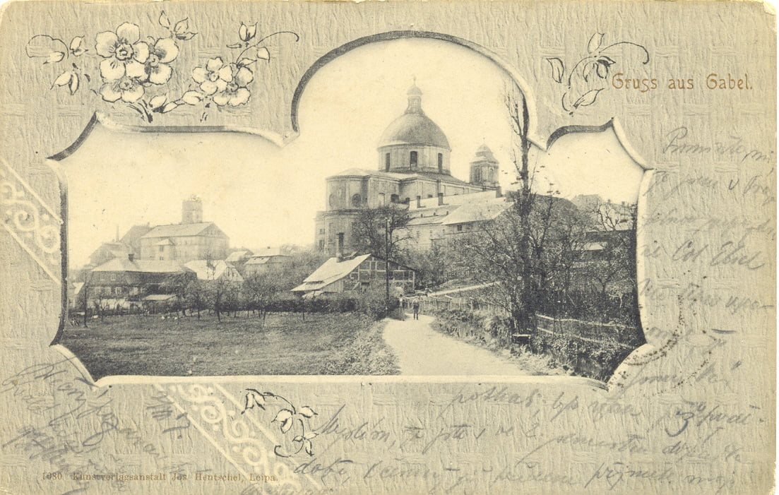 Prastaré město historicky spojené s blízkým hradem Lemberkem (viz kresbu vlevp uprostřed). Kvodlibetová pohlednice odeslaná roku 1905 ukazuje celkový pohled i jednotlivé městské budovy. Dominantní stavbou je barokní chrám sv. Vavřince postavený v letec 1699-1729. Při příležitosti svatořečení sv. Zdislavy, která žila na Lemberku ve 13. stolet byl chrám povýšen papežem Janem Pavlem II. v roce 1995 na menší baziliku zasvěceno oběma světcům. Kromě chrámu je zobrazen vpravo i zámek Nový Falkenburk, který stojí přímo ve městě. Původní tvrz Berky z Dubé z let 1562-72 byla mnohokrát přestavován naposled roku 1901 průmyslníkem baronem Johannem Liebiegem. Morový sloup na náměstí byl vztyčen roku 1686.