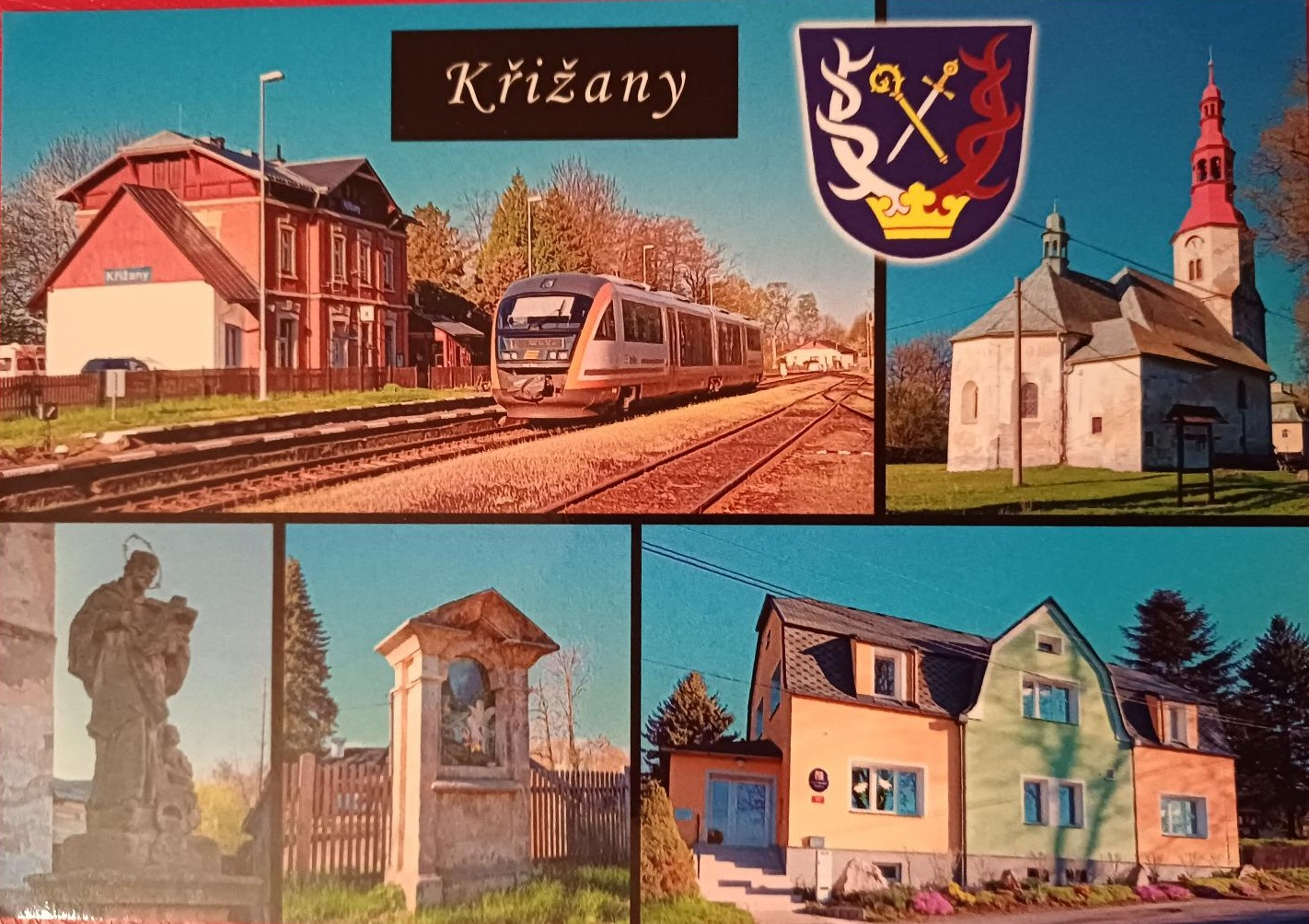 Rozlehlou zemědělskou obec v plochém údolí Ještědského potoka nám představuje pohlednice odeslaná roku 1899. Potok pramení na severozápadním svahu Ještědu, který zavírá obzor hlavní částí pohlednice. Ostrý vrchol mohutné hory je dosud bez své dominanty, horského hotelu. Ten zde byl postaven až v roce 1907. Menší obrázek vlevo nahoře ukazuje pískovcový skalní hřeben zvaný Krkavčí návrší. V popředí je křižanský kostel Maxmiliána. Jeho gotická podoba z roku 1384 byla zásadně zbarokizována v 17. stoleti. V pravo dole je velký Fritschův hostinec a také tehdejší rakouský c.k. poštovní úřad.