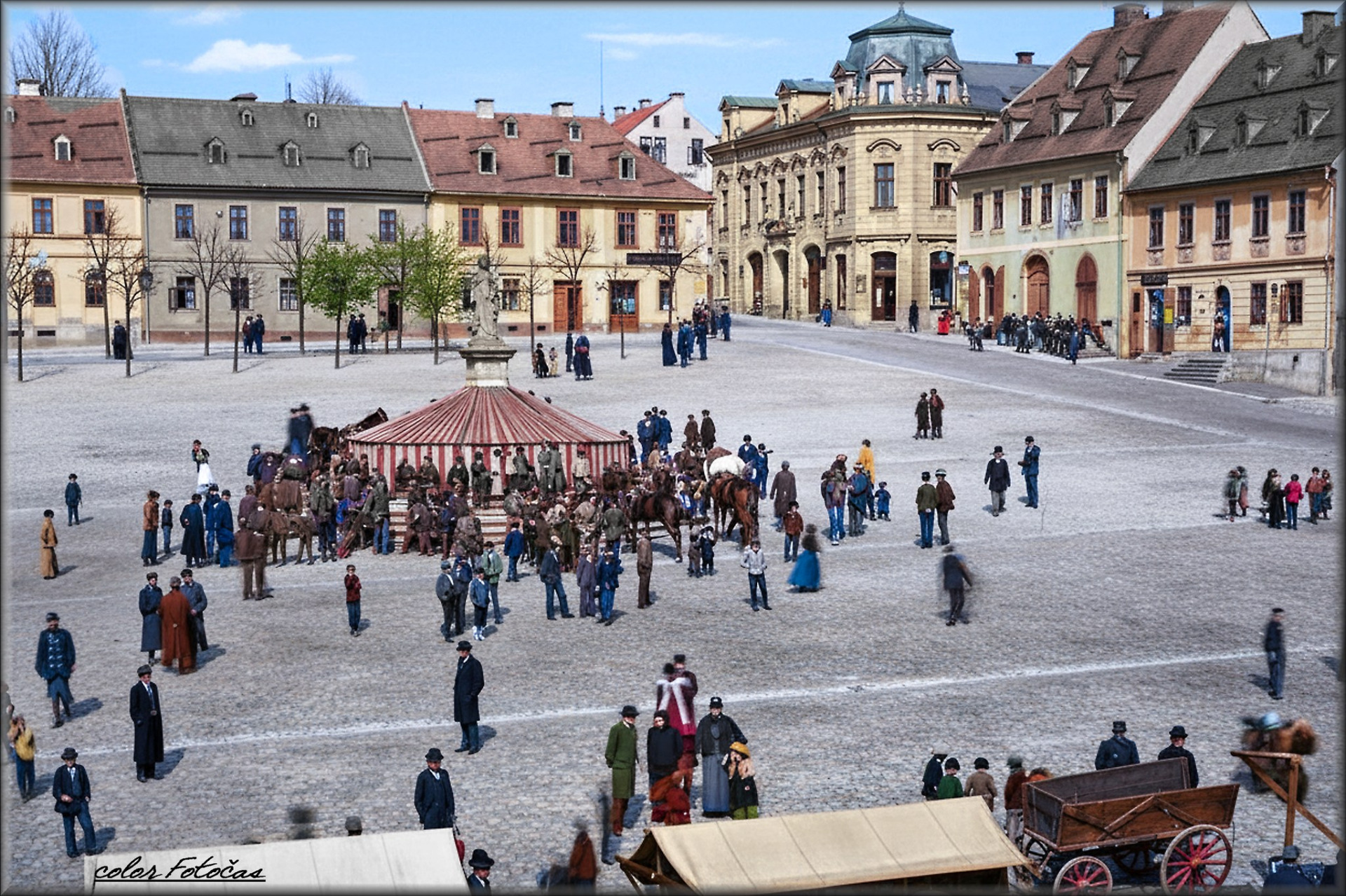 Levá strana náměstí v roce 1916. Přes týden tu bývalo jen pár trhovců, v pátek a v sobotu však jejich stánky náměstí zcela zaplnily. V neděli za pěkného počasí se náměstí stávalo korzem - místem, kde se odbývala společenská setkání zámožných i prostých jabloneckých dam a pánů