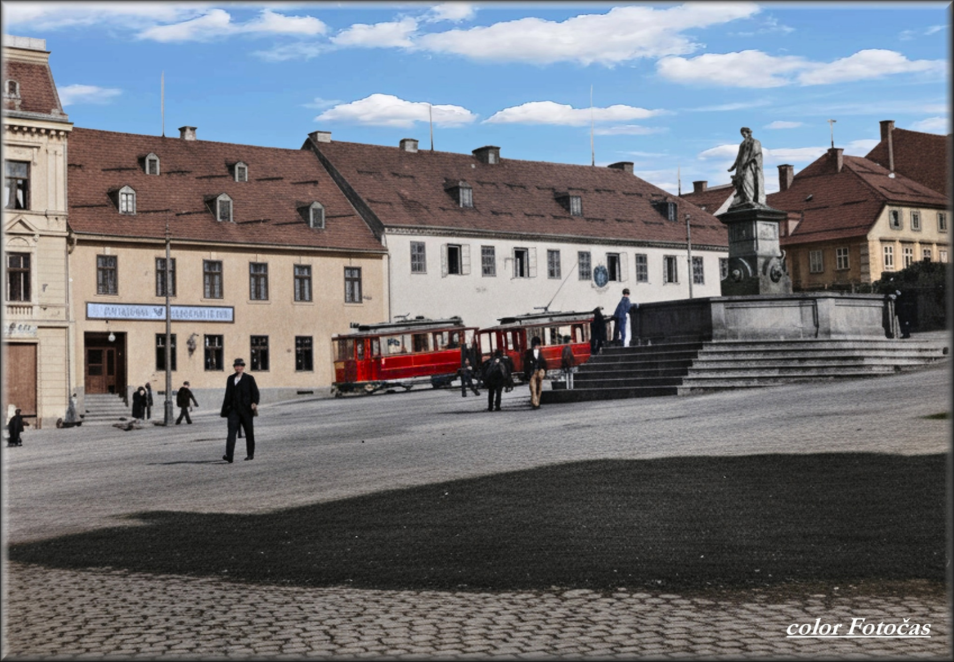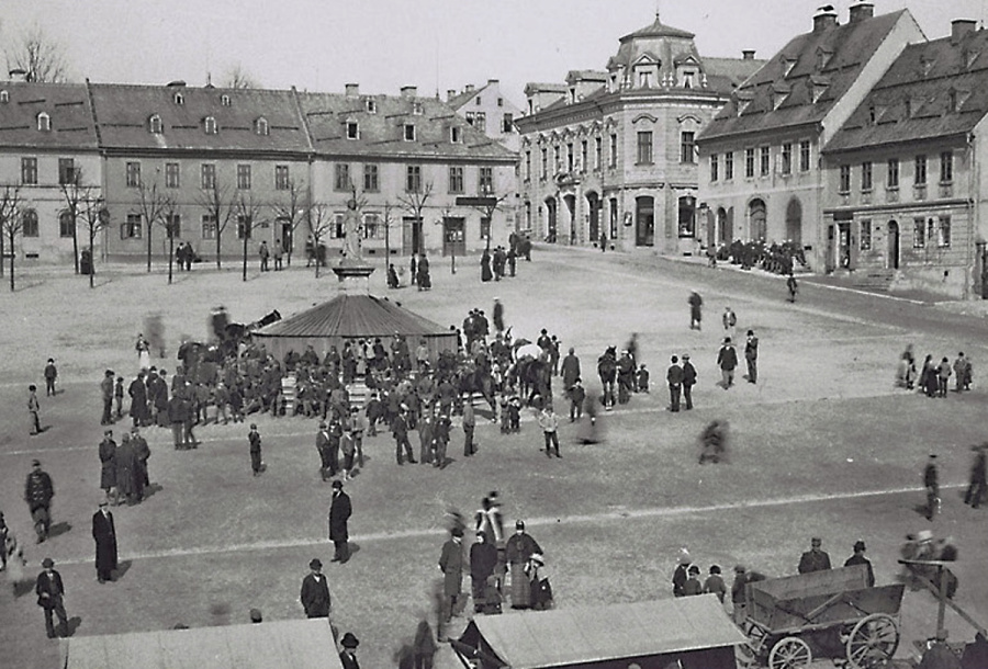 Pravá strana náměstí v roce 1916 s pozoruhodnou stavbou v popředí. Ta patřila podniku městských elektrických drah a bývala v ní čekárna s trafikou a později i knihkupectví. Vedle ní měly svá stanoviště koňské drožky. I když městem jezdily už od února roku 1900 tramvaje, drožkáři jim úspěšně konkurovali až do konce 1. světové války.