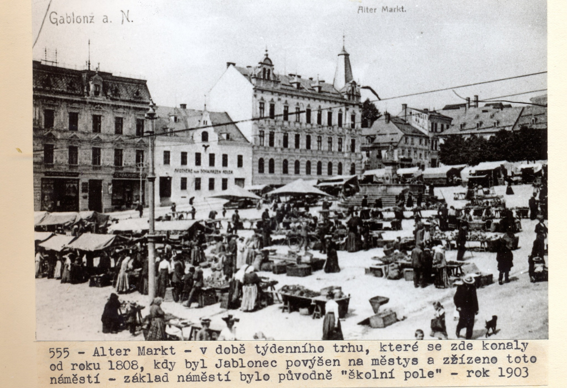 Spolu s povýšením na městys v roce 1808 obdržel Jablonec právo pořádat trhy. Proto bylo při tehdejší formanské cestě do Smržovky založeno prostorné tržiště ve tvaru obdélníku. Po jeho obvodu se začaly stavět první jednopatrové domy, a tak postupně vznikalo náměstí, nesoucí název Alter Markt - Starý trh. Jeho podobu z té doby, často poněkud idealizovanou, bychom mohli vidět na několika archivních obrazech a kresbách. Až fotografie a pohlednice z konce 19. a počátku 20. století nám věrohodně ukazují, jak s postupujícími lety náměstí měnilo svoji podobu.