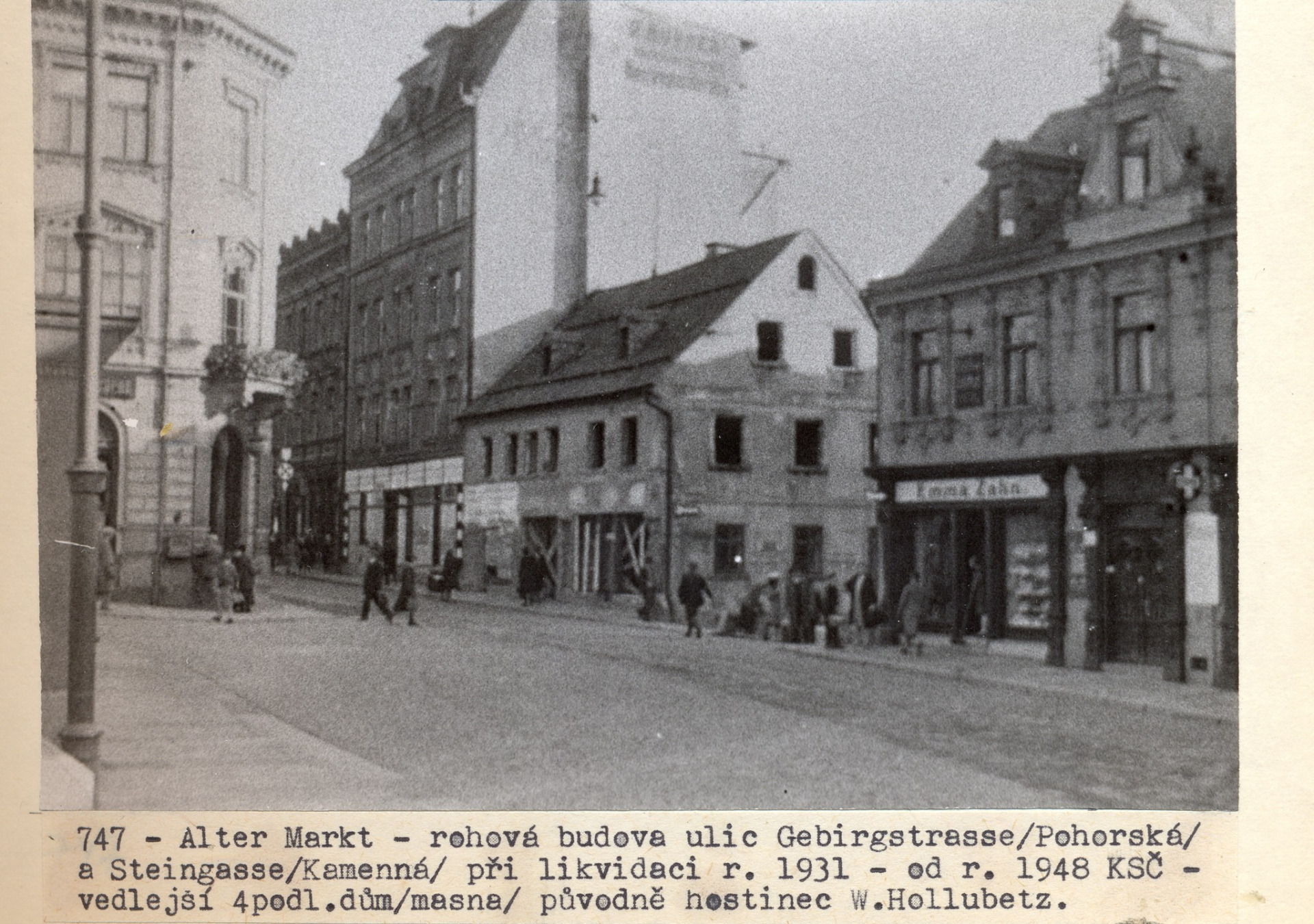 Od r. 1948 KSČ – vedlejší 4 podlažní. dům / masna / původně hostinec W. Holubetz."
