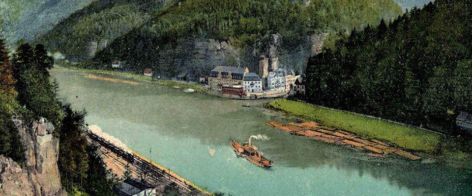Toto je klasický pohled na obec s majestátním Panským domem (Herrenhaus, původně skladové prostory, později hotel) ve středu snímku… vpravo je k němu "přilepena" Labská celnice…