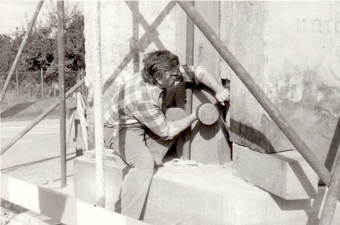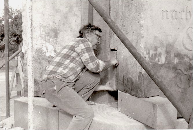 Jiří Hofman staví v roce 1984 Pyrám z kusů nalezených kolem křižovatky v příkopech, kam byl kdysi stržen, když překážel a připomínal slávu monarchie. Písmo obnovil kameník pan Vokatý z Hrubé Skály.
