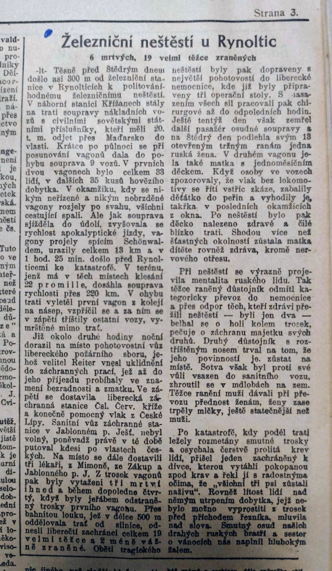 Před osmdesáti lety (prosinec 1945) došlo u Rynoltic k železničnímu neštěstí. První odstavec článku ze Stráže severu je přepsaný, zbytek je v článku.Železniční neštěstí v Rynolticích6 mrtvých, 19 velmi těžce zraněnýchTěsně před Štědrým dnem došlo asi 300 m od železniční stanice v Rynolticích k politováníhodnému železničnímu neštěstí. V náhorní stanici Křižanech stály na trati soupravy nákladních vozů s civilními sovětskými státními příslušníky, kteří měli 20 t. m. odjet přes Maďarsko do vlasti. Krátce po půlnoci se při posunování vagonů dala do pohybu souprava 9 vozů. V prvních dvou vagonech bylo celkem 33 lidí, v dalších 35 kusů hovězího dobytka. V okamžiku, kdy se nikým neřízené a nikým nebrzděné vagony rozjely po svahu, všichni cestující spali. Ale jak souprava sjížděla do údolí, zvyšovala se rychlost apokalyptické jízdy, vagony projely celým Schöňwaldem, urazily celkem 13 km a v 1 hod. 25 min. došlo před Rynolticemi ke katastrofě. V terénu, jenž má v těch místech klesání 22 promile, dosáhla souprava rychlosti přes 220 km. V ohybu trati vyletěl první vagon z kolejí na násep, vzpříčil se a za ním se vzápětí tříštily ostatní vozy, vymrštěné mimo trať.