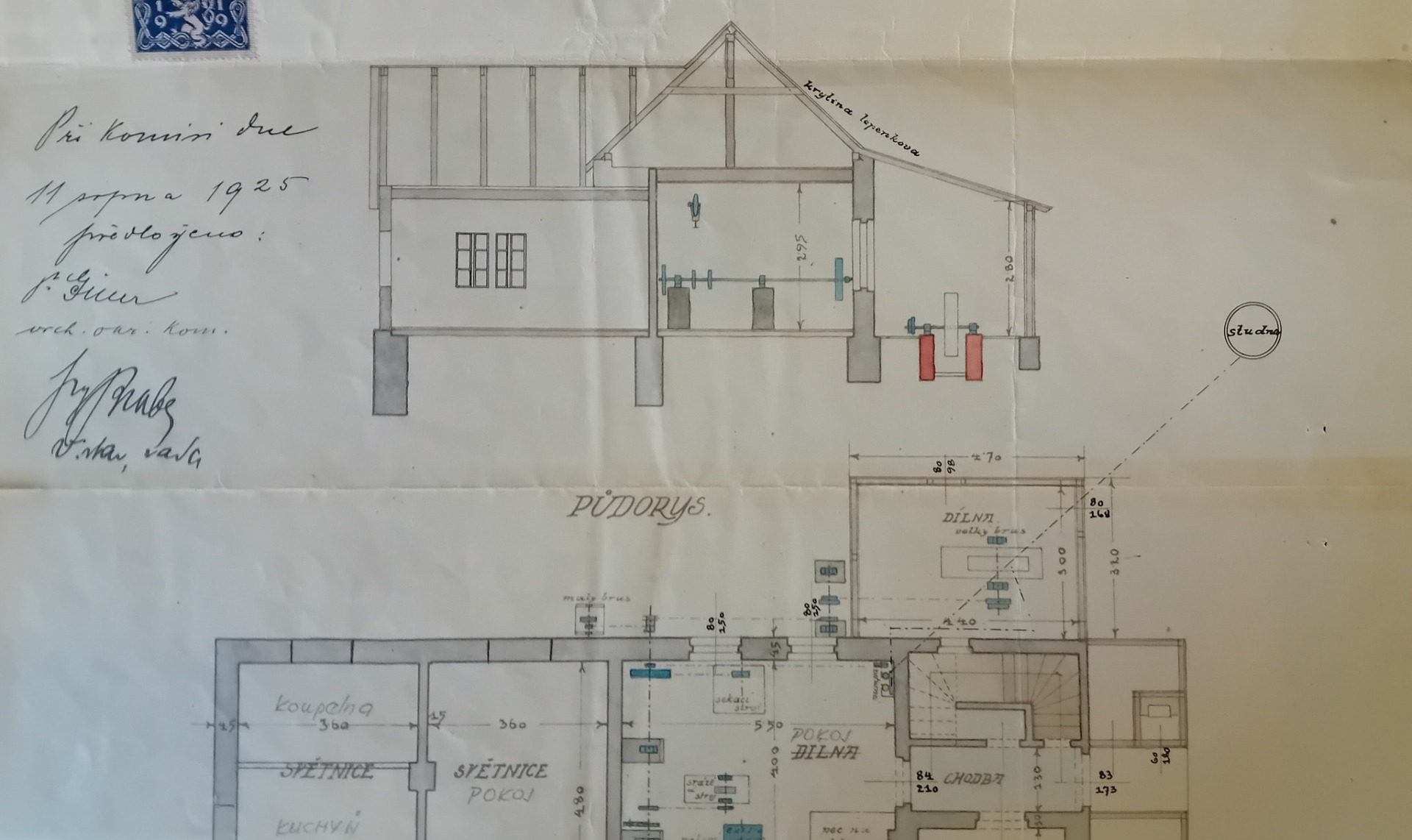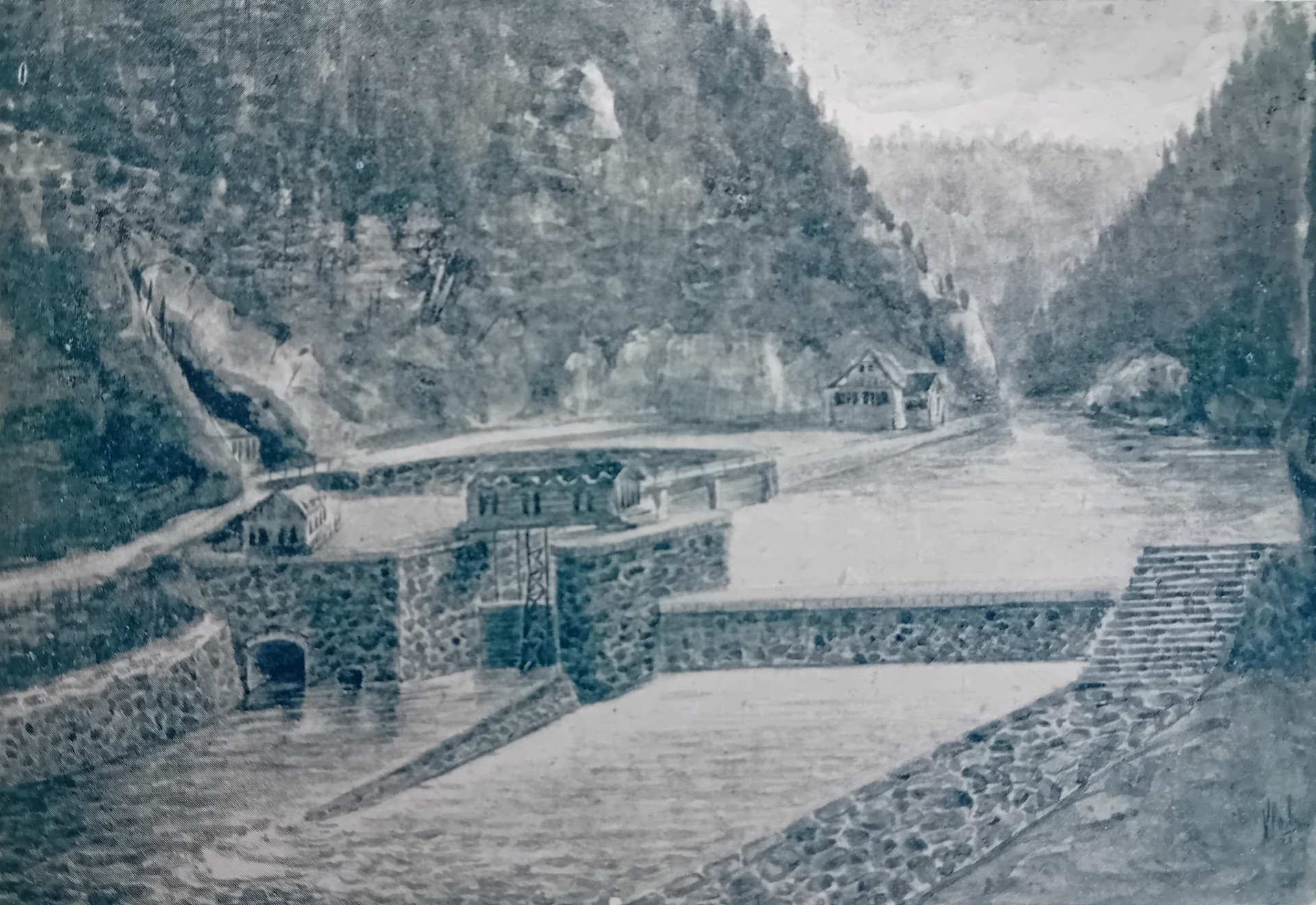 Tuto poněkud idealizovanou malovanou pohlednici vytiskli v tiskárně Josefa Glose v Semilech ... byla vydávána v době výstavby Zemské hydrocentrály na Podspálově ... dobový popisek na ní uvádí - " Jez na Jizeře , na rozhraní Riegerovy a Palackého stezky na řece Jizeře v okresu semilském staví zemský správní výbor nákladem 27 milionů Kč. elektrárnu s vodním pohonem o síle 2385 HP a roční výrobou 11 milionů kwh . " ... zkratka HP je anglicky Horse Power - koňská síla ...