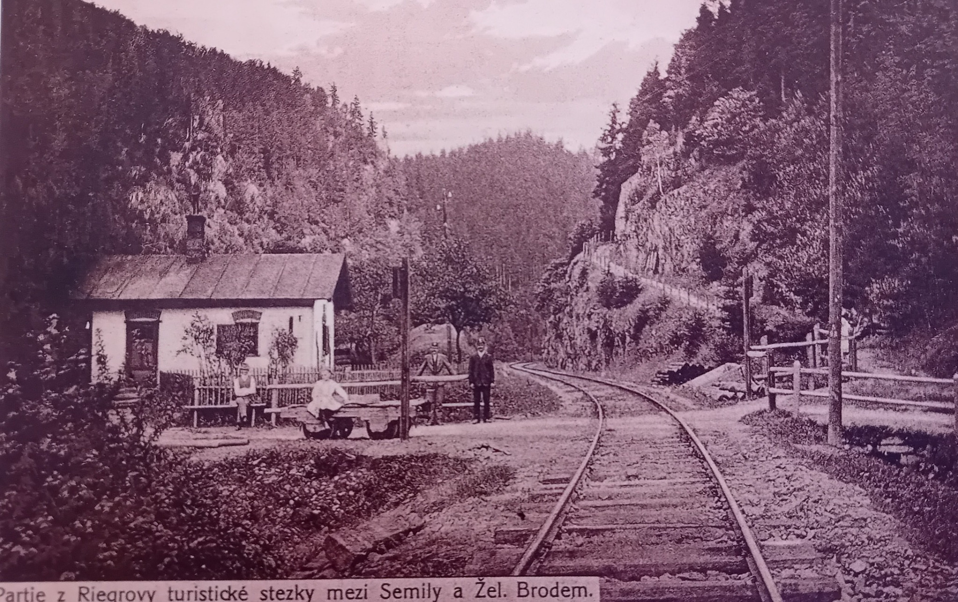 pohled na drážní domek a stezku vzhůru stoupající k Palackého stezce od Riegerovy stezky , počínající na soutoku Vošmendy a Kamenice ... v roce 1938 zářez nad železniční tratí překlene silniční most nového soumostí a dobuduje se silnice od něj k Podbozkovu , i tato stezka se rozšíří na cestu k Crhově turistické chatě a Zemské hydrocentrále ... cesta přes koleje vede dolů ke Kamenici , kdy do té doby bývaly lávky a dřevěné mosty přes řeku , po nichž se mnozí dostávali na druhý břeh a dále k Železnému Brodu ... ( Pohlednice z mé sbírky )