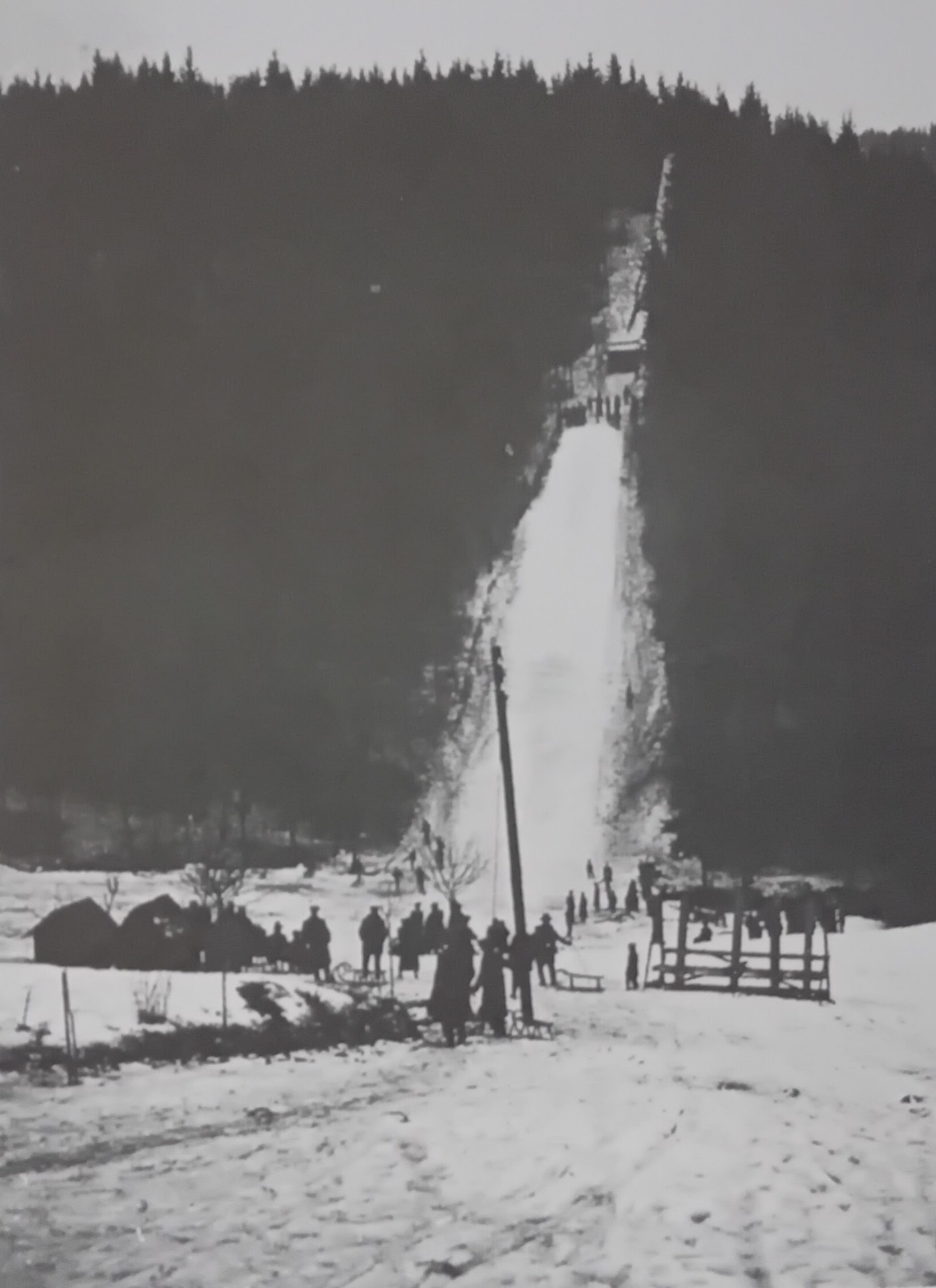 ( poslední fotografie z Krkonoš je čistě ilustrační , na jakých lyžích a jakým stylem se skákalo - skokan je občan z Bozkova minulých časů ) ... podle zápisků na starých fotografiích , které pořídil z části neznámý fotograf a zčásti František Dolenský z Bozkova , některé skoky byly až 75 metrů dlouhé ... skákalo se tady zhruba až do roku 1945 , což je poměrně dlouhých patnáct let ... Dodatek ... protože záznamy v archivu byly jaké jsou zde uvedeny , nevadí , že se dodatečně mohou upravit , co se týká doby , do kdy byl můstek používán ... to je právě o té historii , že se nechá dohledat občas něco nového ... Není to tak dávno , zhruba dvacet let tomu je , kdy byl průsek ještě znatelný , zbytky můstku a poházená prkna v místech odraziště nezasvěceným moc neřekla , avšak dnes si mladý lesní porost bere vše zpět , již málo je znát toto místo až dolů na louku , kde byl buben a dojezd ...