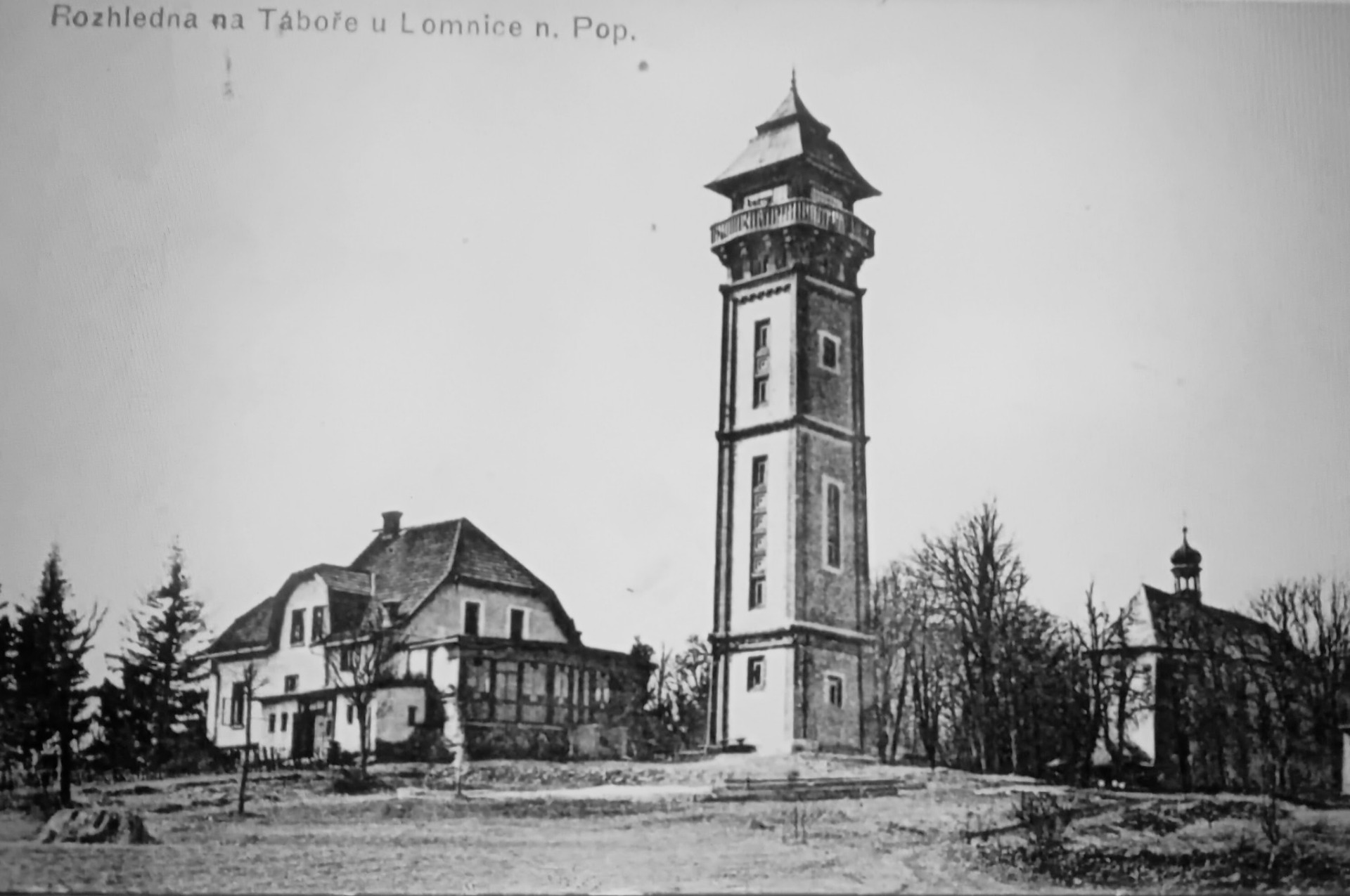 Nad Lomnicí nad Popelkou , na vrcholu kopce Chlum , stojí dodnes dominantní stavba , zvána některými " maják Lomnicka " ... Jde o kamennou rozhlednu , z níž lze říci , lze obhlédnout takřka čtvrtinu Čech ... Nejdříve tu stávala rozhledna dřevěná , v letech 1888 - 97 , s vedle stojící chatou ... ale tu začala napadat dřevokazná houba a bylo ji nutno strhnout ... V roce 1911 místo ní vyrostla nová rozhledna z cihel , které byly vypáleny v Pulicích u Dobrušky ... bylo to na popud zdejšího lomnického Okrašlovacího spolku a zejména řídícího učitele Josefa Tichánka , po němž je pojmenována a který byl inspirován rozhlednou na Černé Studnici v Jizerských horách ... byla uspořádána finanční sbírka ... stavba byla zadána staviteli Václavu Slabovi , stála tehdy 22 000 korun a konečná výška rozhledny byla 35 metrů ... vedle ní byla v roce 1913 postavena také nová turistická chata , pojmenovaná po Ignáci Hornychovi , lomnickému textilnímu podnikateli , který mimo to v roce 1898 nechal postavit na Tábor poutní křížovou cestu o 13 zastaveních ... Vedle rozhledny stojí dodnes barokní chrám Proměnění páně ... ten nechala postavit v roce 1704 hraběnka Konstancie z Morzinů ... předtím tu stál dřevěný kostelík postavený Albrechtem z Valdštejna v roce 1527 a ještě dříve dřevěná kaple z poloviny 14. století ... Odkud ale vzala hora Tábor své pojmenování - kvůli podobenství z jižního svahu s horou Tabor v Galilei u jezera Kineret ... a jelikož se na stejnojmenné hoře v Izraeli odehrála biblická událost , zapsaná do Nového zákona a na její paměť byl na té hoře postaven chrám , obojí bylo " přeneseno " na tento kopec a to doslova , jak jeho pojmenování , tak i chrám ... ( Dobové turistické pohlednice )
