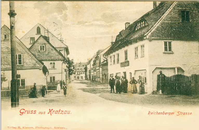 Velká podstávková budova v popředí vpravo je prospěrující Podnik rodiny Franze Bergmanna "Gasthaus zum grünen Kranz" (Restaurace u zeleného Věnce). Ten,' jak uvádí jeho tištěná reklama, nabízel "váženým ob-čanům Chrastavy, ale stejně tak i široké veřejnosti z okolí, přátelské pohostinské služby ve svém lokále, Pro pány - obchodní cestující pak dobré a lacíně obchodní tzv, cizinecké pokoje. Lokál je vhodnou odpočinkovou zastávkou i pro bicyklisty, nabízí i zahradní posezení, v lokálu je klavír i moderní gramofon...